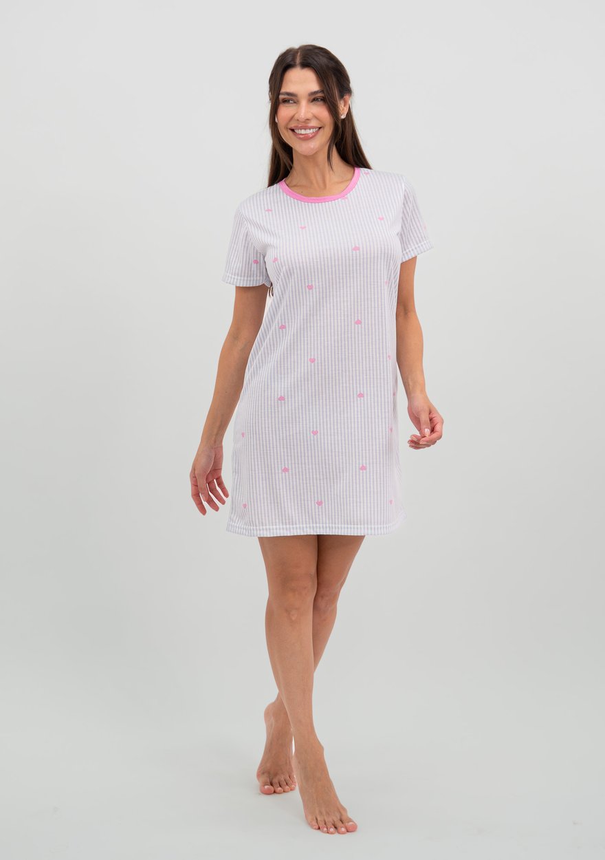 A camisola Coração Listrado une a doçura do amor com a leveza das noites bem dormidas. Com uma estampa charmosa de coração sobre listras, ela é perfeita para quem ama conforto com um toque moderno e delicado.