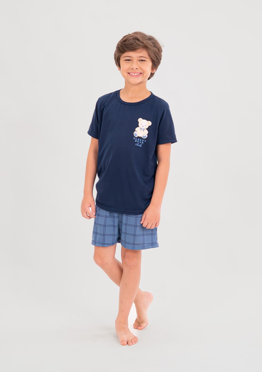 Pijama infantil menino Bear Family, pensado para unir conforto, suavidade e um toque lúdico. A blusa azul-marinho com ursinho estampado traz um visual encantador, combinando perfeitamente com o shorts xadrez azul.