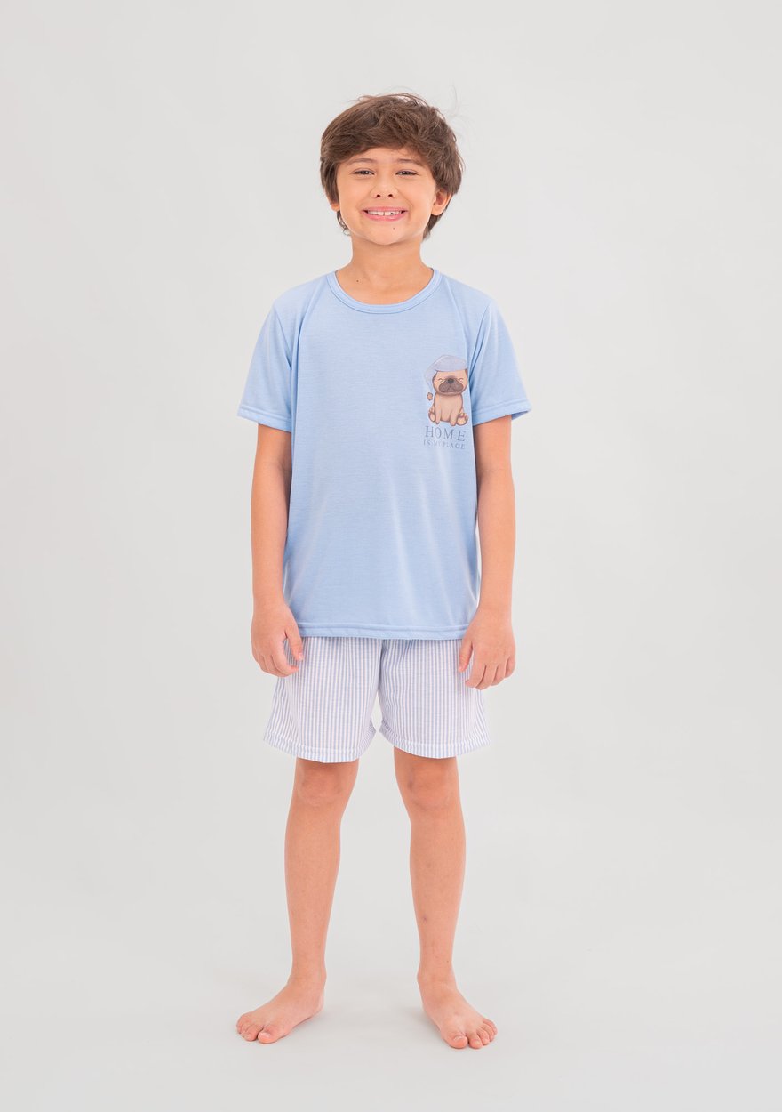 Pijama infantil masculino Sleepy Family, ideal para garantir conforto, liberdade e noites bem dormidas. A blusa azul com estampa de cachorro de toca traz um visual divertido e moderno, combinando com o shorts de estampa rotativa para um conjunto leve e confortável.