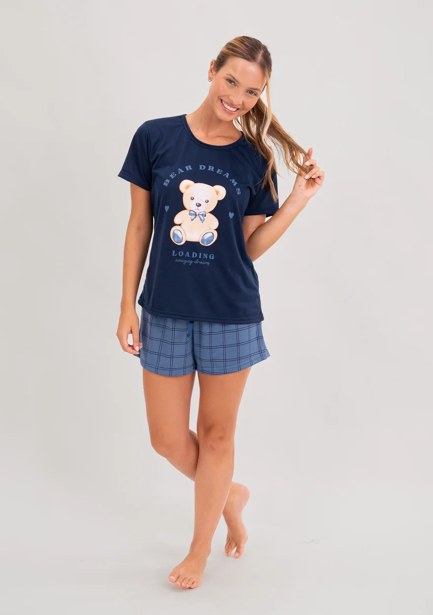 Pijama feminino Bear Family, ideal para quem busca conforto, leveza e um visual fofo. A blusa azul-marinho com estampa de ursinho traz charme e delicadeza, enquanto o shorts xadrez azul completa o conjunto com estilo moderno e descontraído.