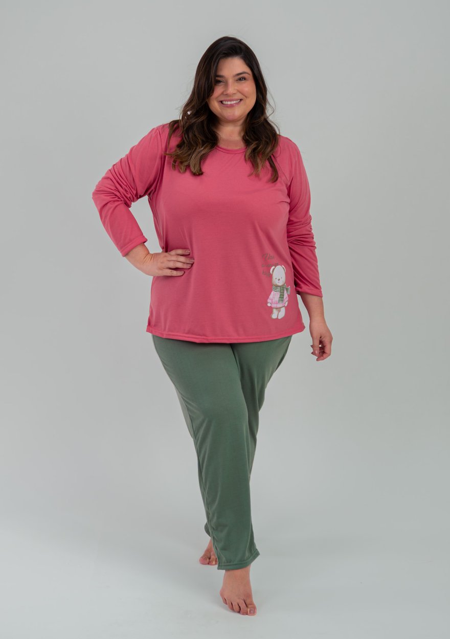 O pijama feminino Hug foi desenvolvido especialmente para proporcionar conforto, leveza e um visual delicado para suas noites de descanso. A blusa rosa com um ursinho discreto na lateral inferior traz um toque fofo e elegante, enquanto a calça verde complementa o conjunto com um visual moderno e aconchegante.