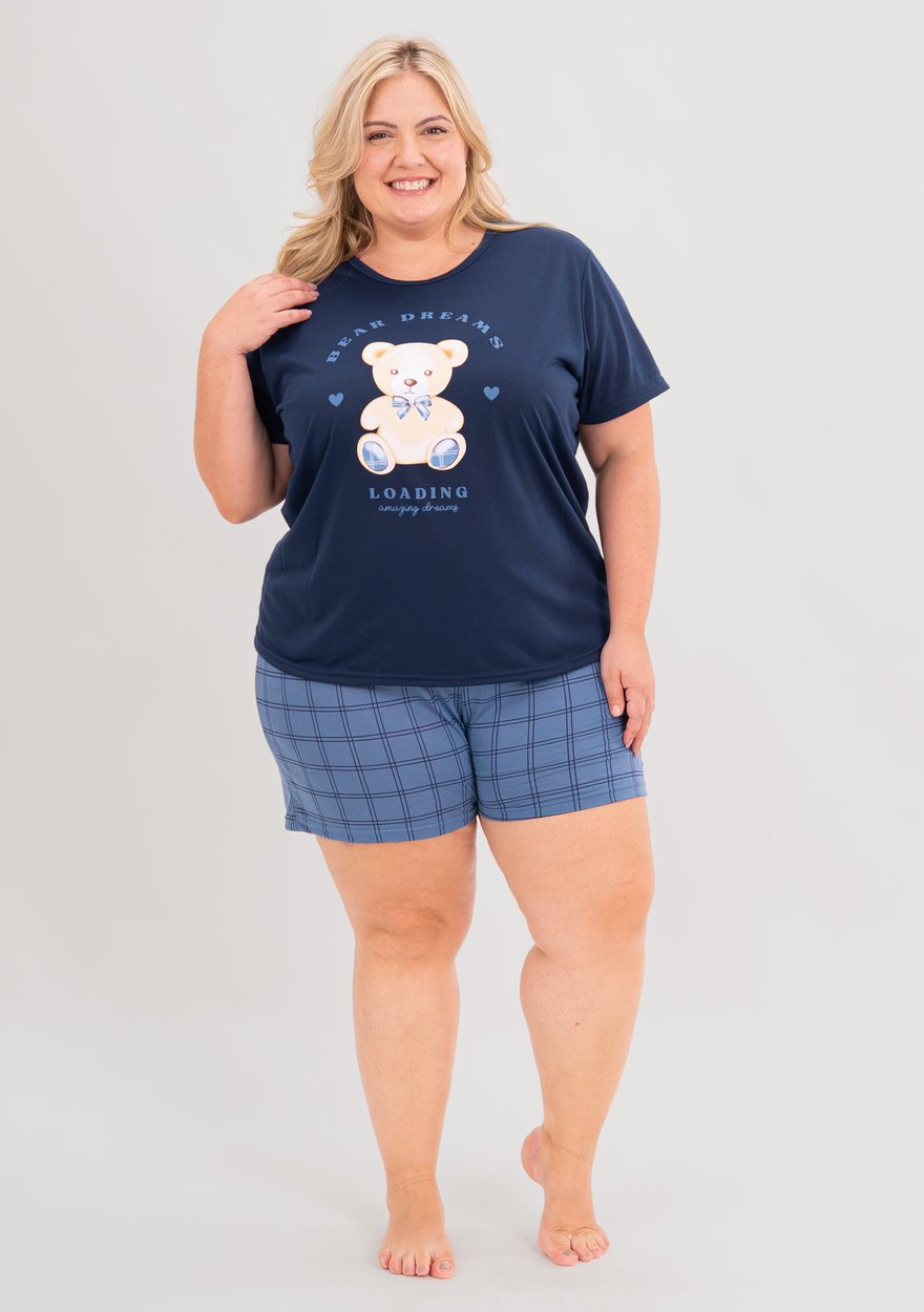 Pijama feminino plus size Bear Family, desenvolvido para oferecer conforto máximo, ótimo caimento e liberdade de movimento. A blusa azul-marinho com ursinho estampado cria um visual moderno e delicado, combinando com o shorts xadrez azul para um look leve e estiloso.