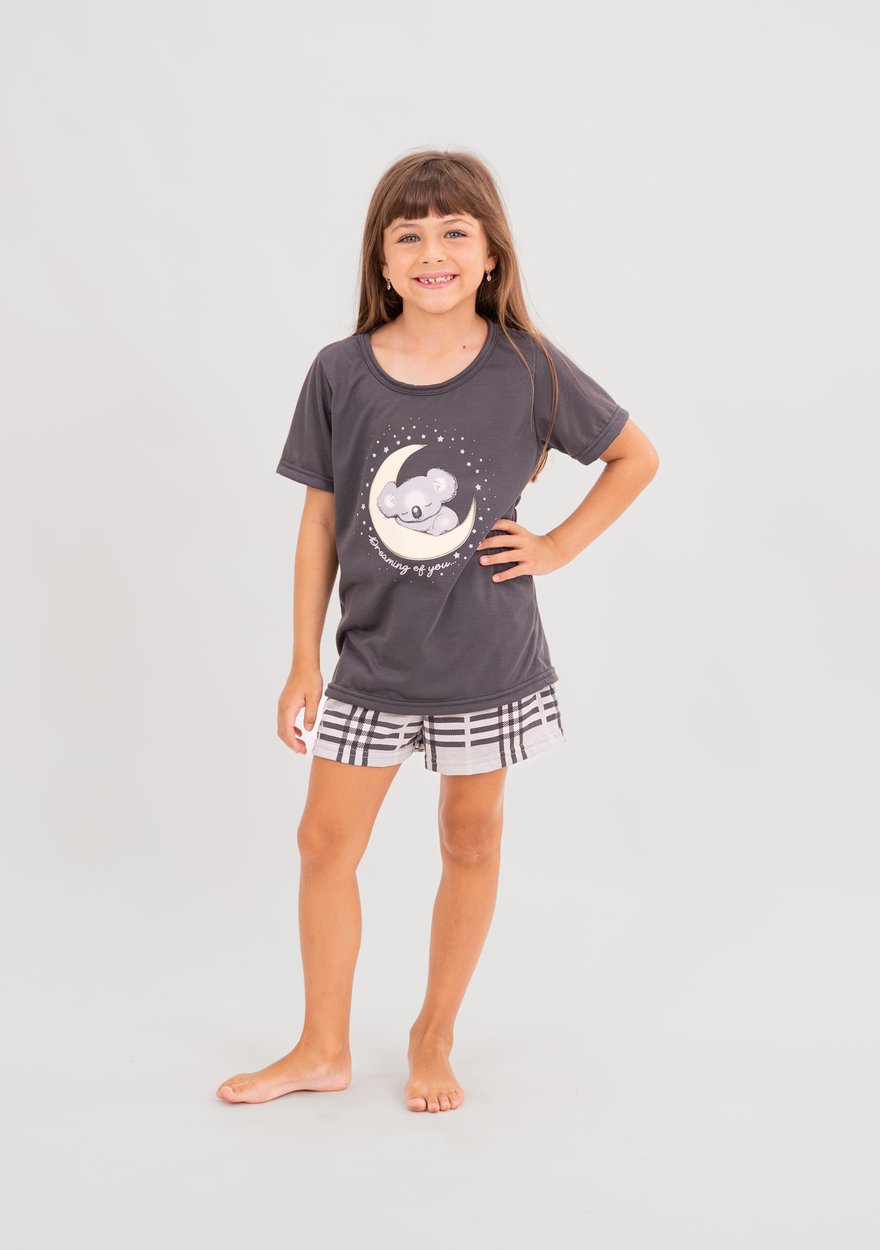 Pijama infantil feminino Dream Family, perfeito para noites tranquilas e cheias de conforto. A blusa cinza com estampa de coala encanta com seu visual fofo e delicado, enquanto o shorts com estampa rotativa traz leveza e diversão.