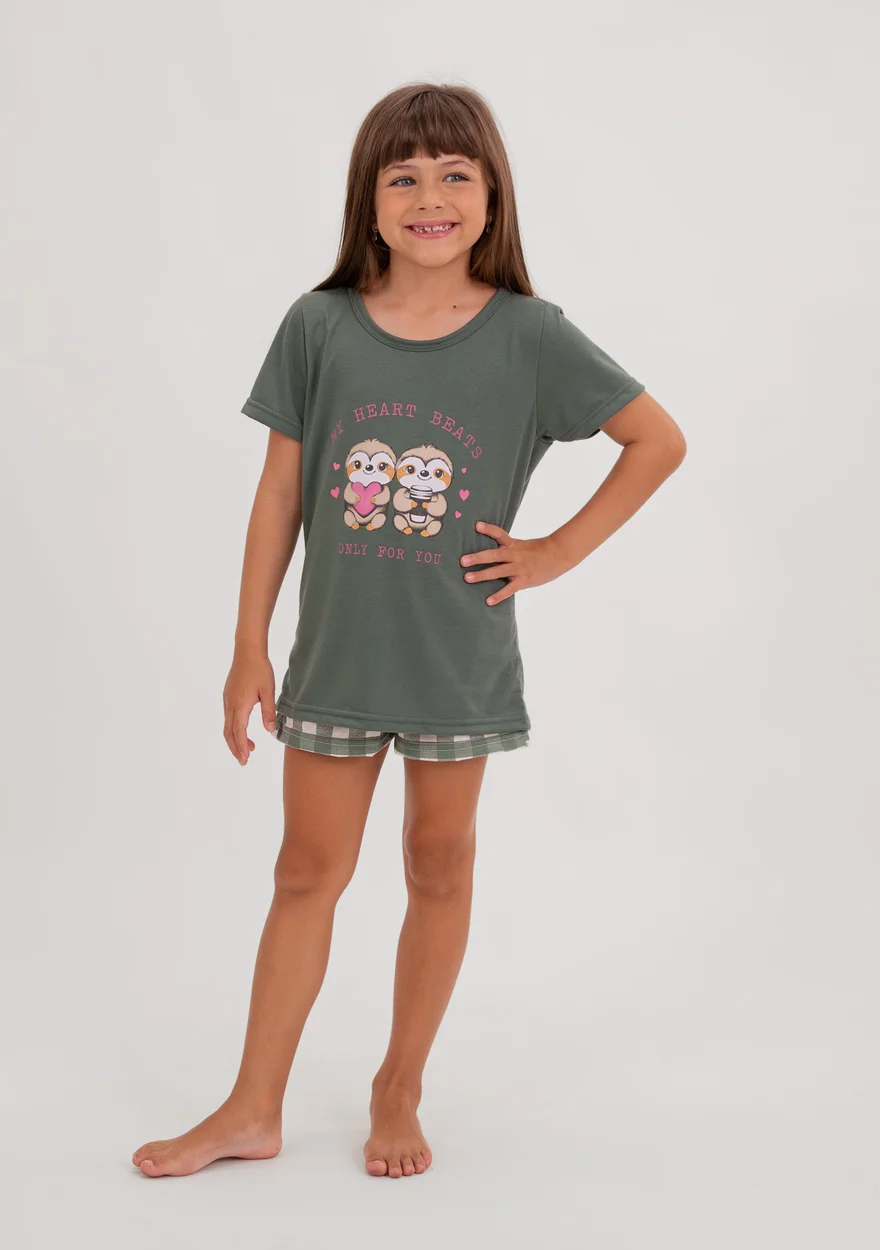 Pijama infantil feminino Sloth Family, perfeito para noites confortáveis e cheias de fofura. A blusa verde com estampa de preguiça encanta as crianças, enquanto o shorts xadrez verde traz um visual divertido e moderno.