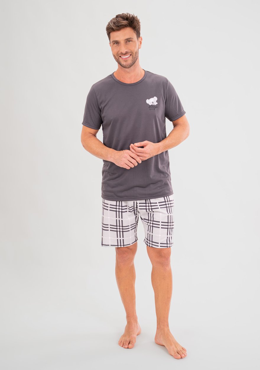 Pijama masculino Dream Family, desenvolvido para proporcionar conforto, leveza e bem-estar. A blusa cinza com estampa de coala cria um visual moderno e aconchegante, combinando com o shorts de estampa rotativa para um estilo casual e confortável.