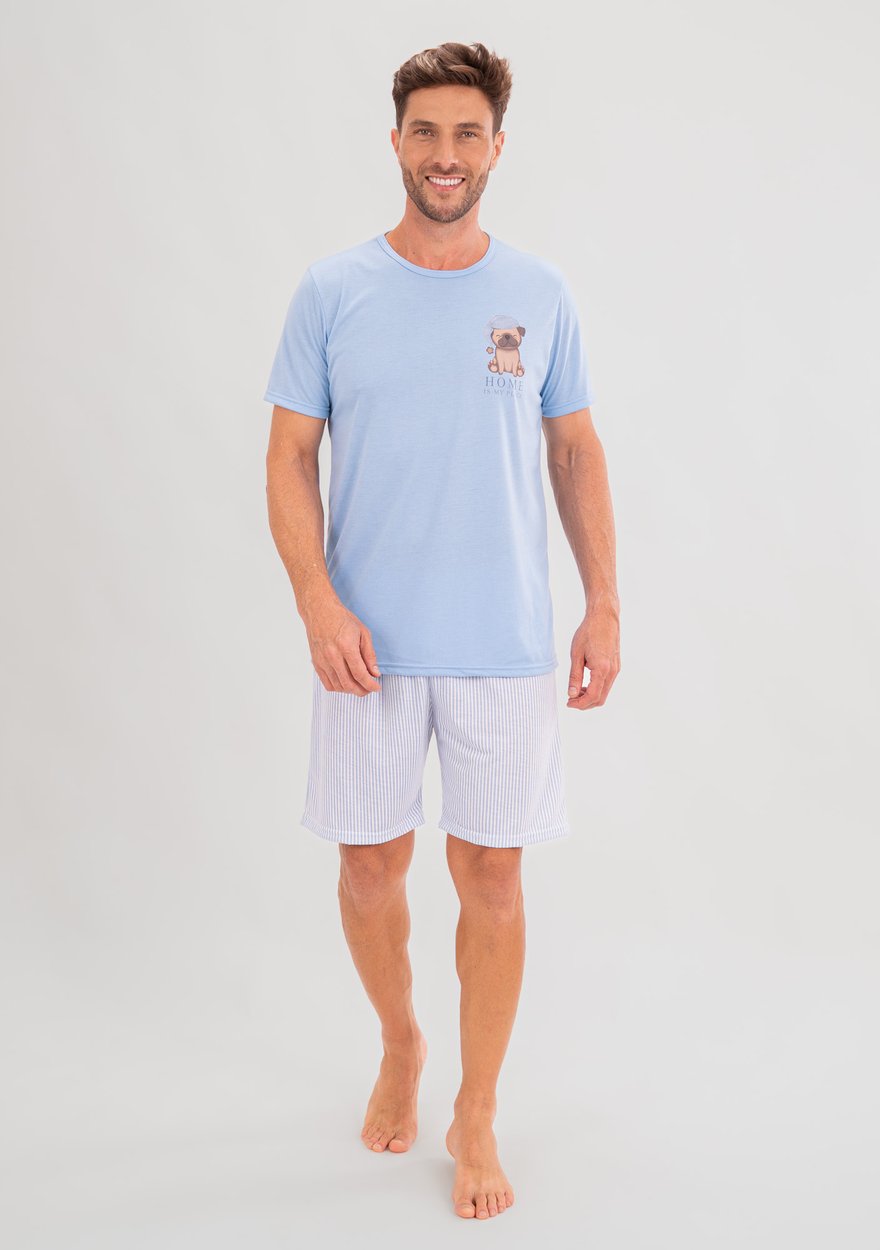 Pijama masculino Sleepy Family, desenvolvido para proporcionar conforto, leveza e bem-estar. A blusa azul com estampa de cachorro de toca cria um visual moderno e aconchegante, combinando com o shorts de estampa rotativa para um estilo casual e confortável.
