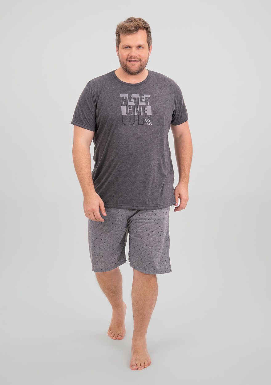 Confeccionado em malha PV (65% poliéster e 35% viscose), ele oferece um toque macio, é leve e ideal para noites relaxantes ou dias tranquilos em casa. A estampa “Nunca Desista” traz um toque motivacional ao visual, tornando o pijama uma peça que inspira até nos momentos mais simples.